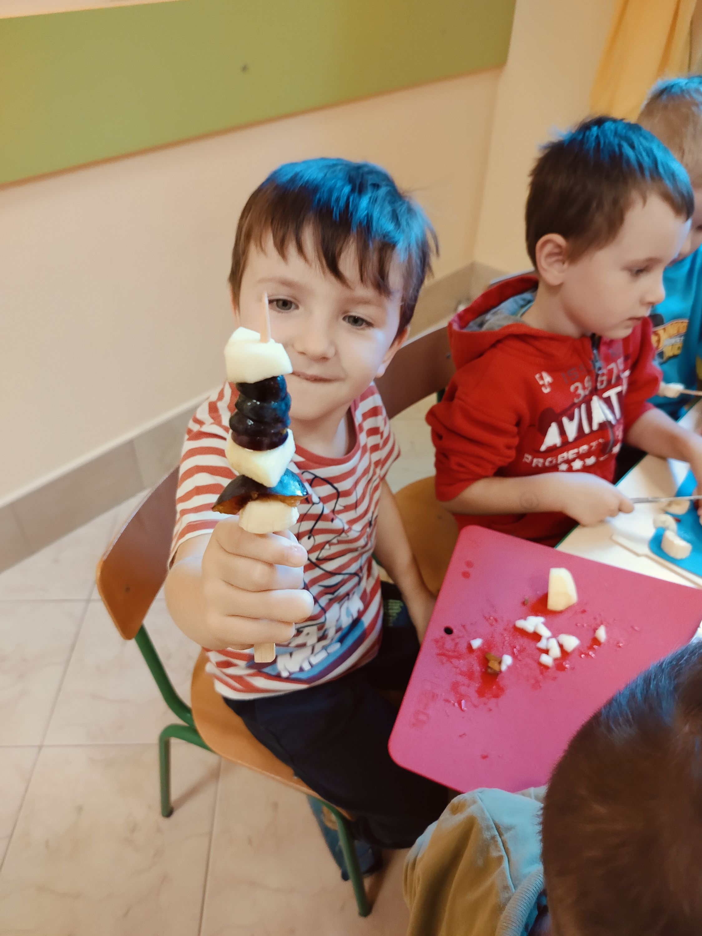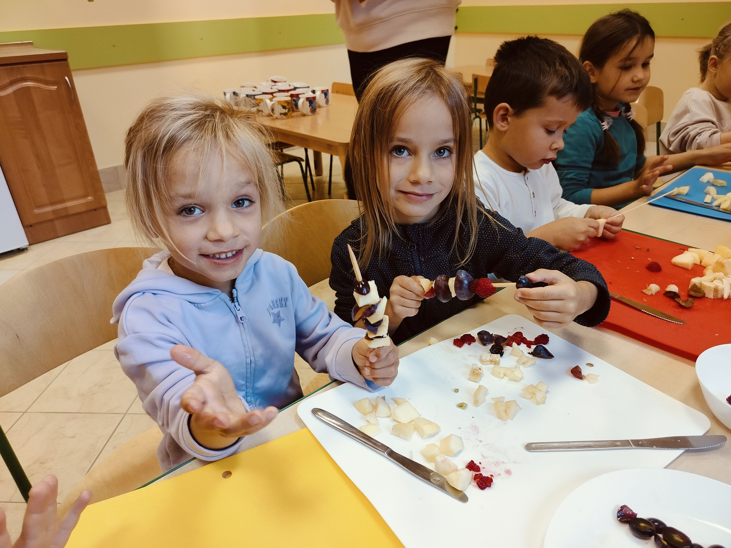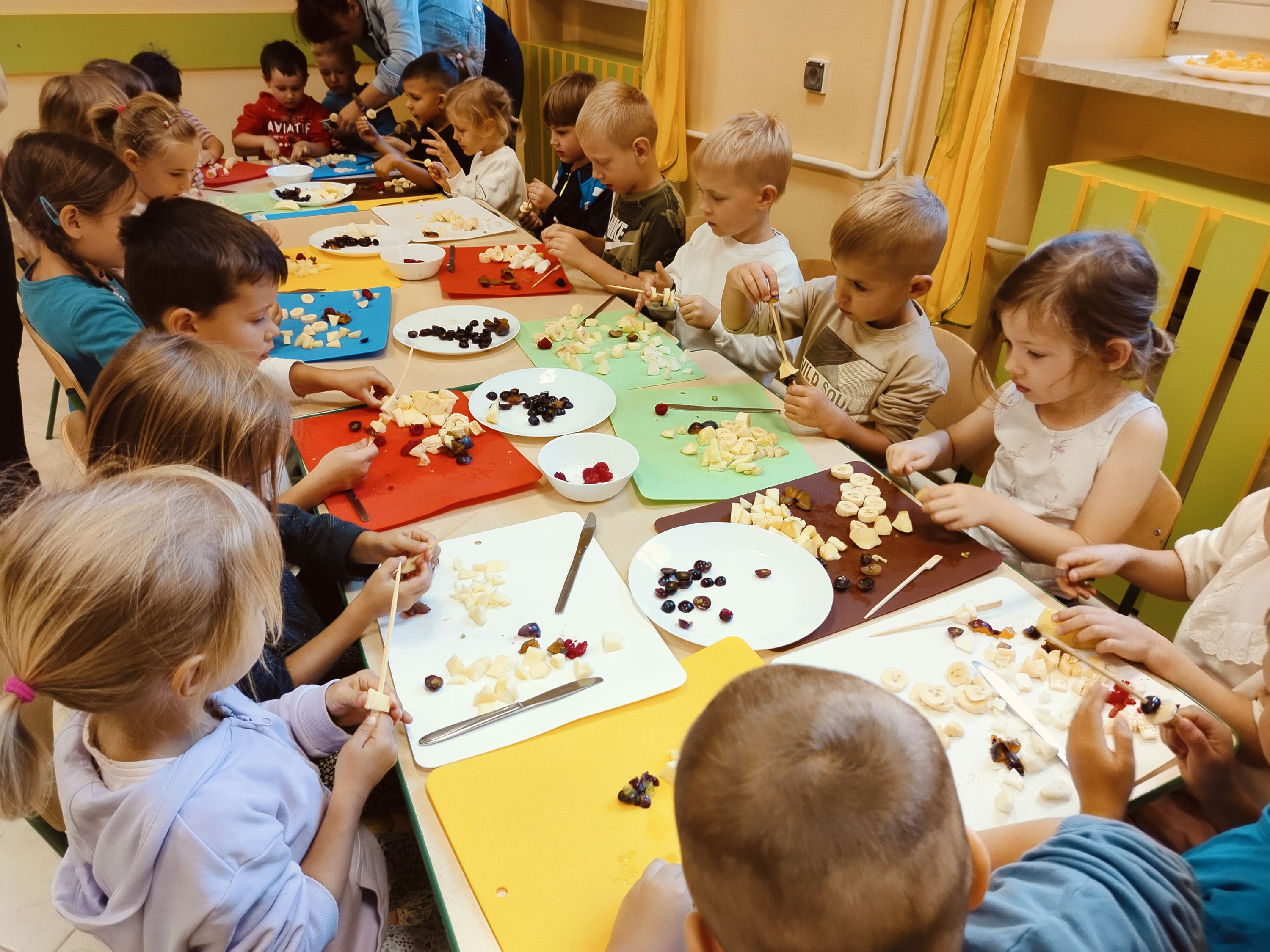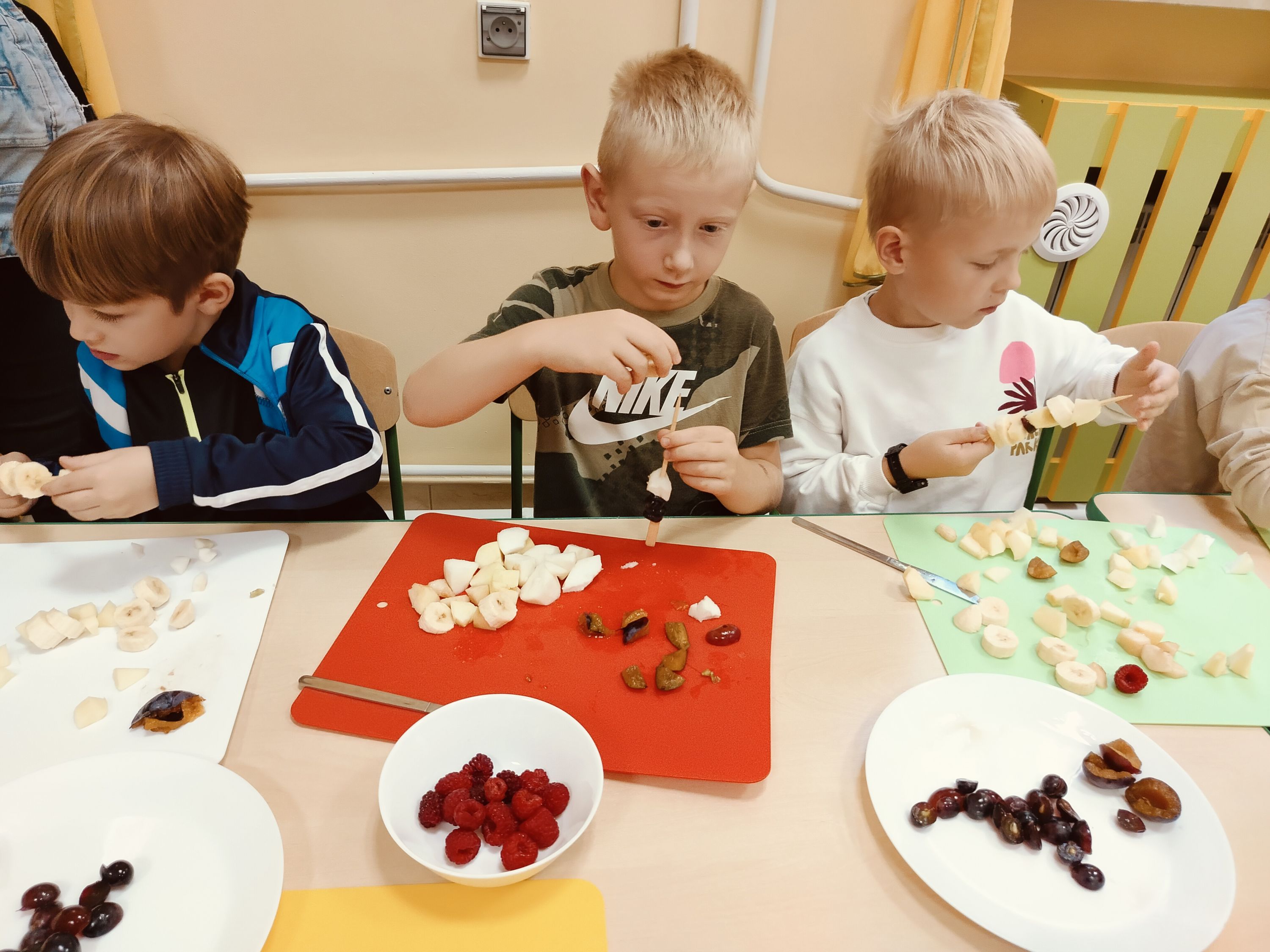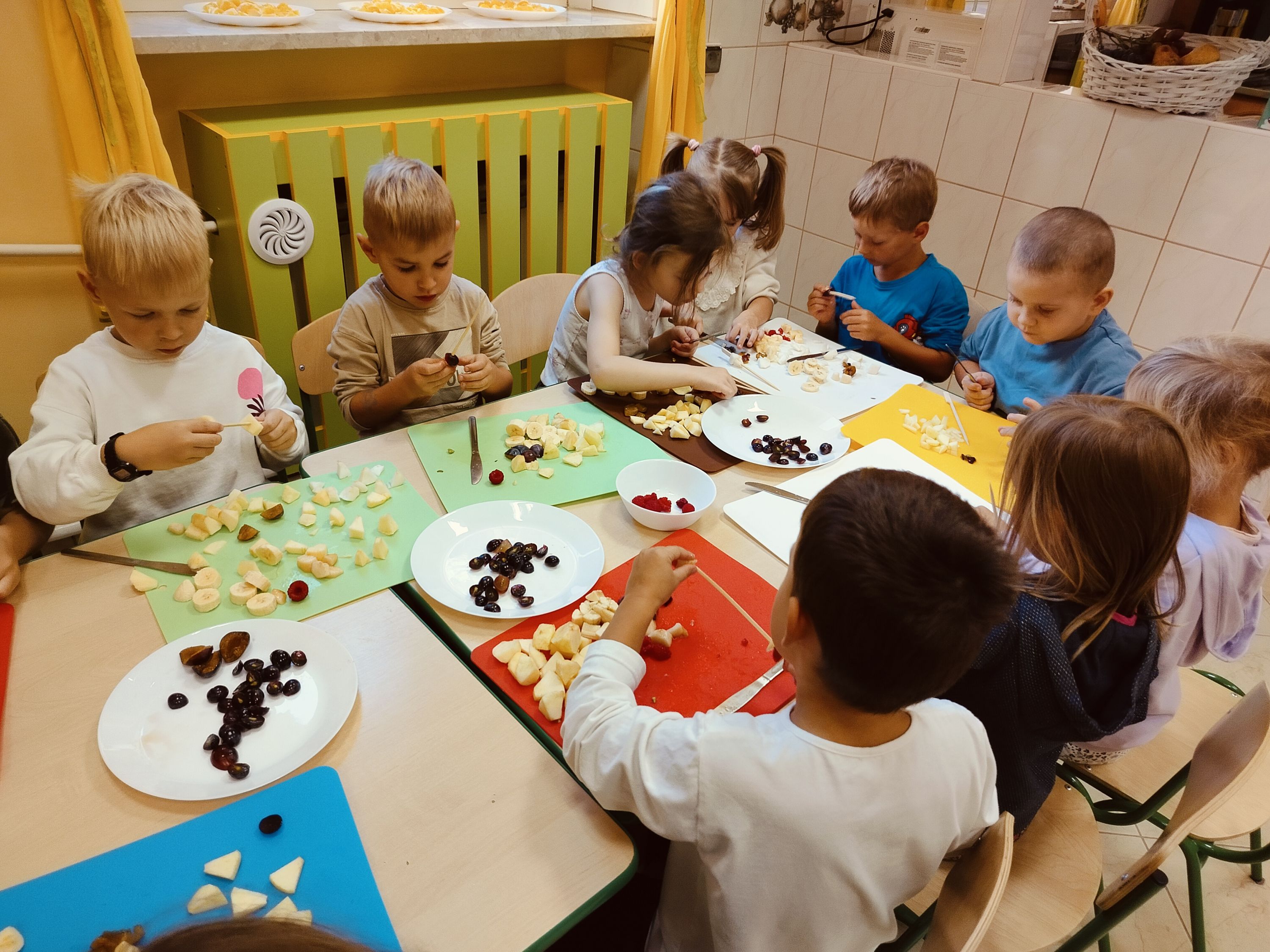 Jak jesień to oczywiście i jej owoce. Motylki i Pszczółki miały okazję poznawać je wielozmysłowo przez oglądanie, dotykanie, wąchanie, smakowanie. Ale na tym nie koniec. Dzieci mogły zrobić owocowe szaszłyki, które z apetytem zjadły na drugie śniadanie. Zaangażowanie przedszkolaków było ogromne! Brawo!!!