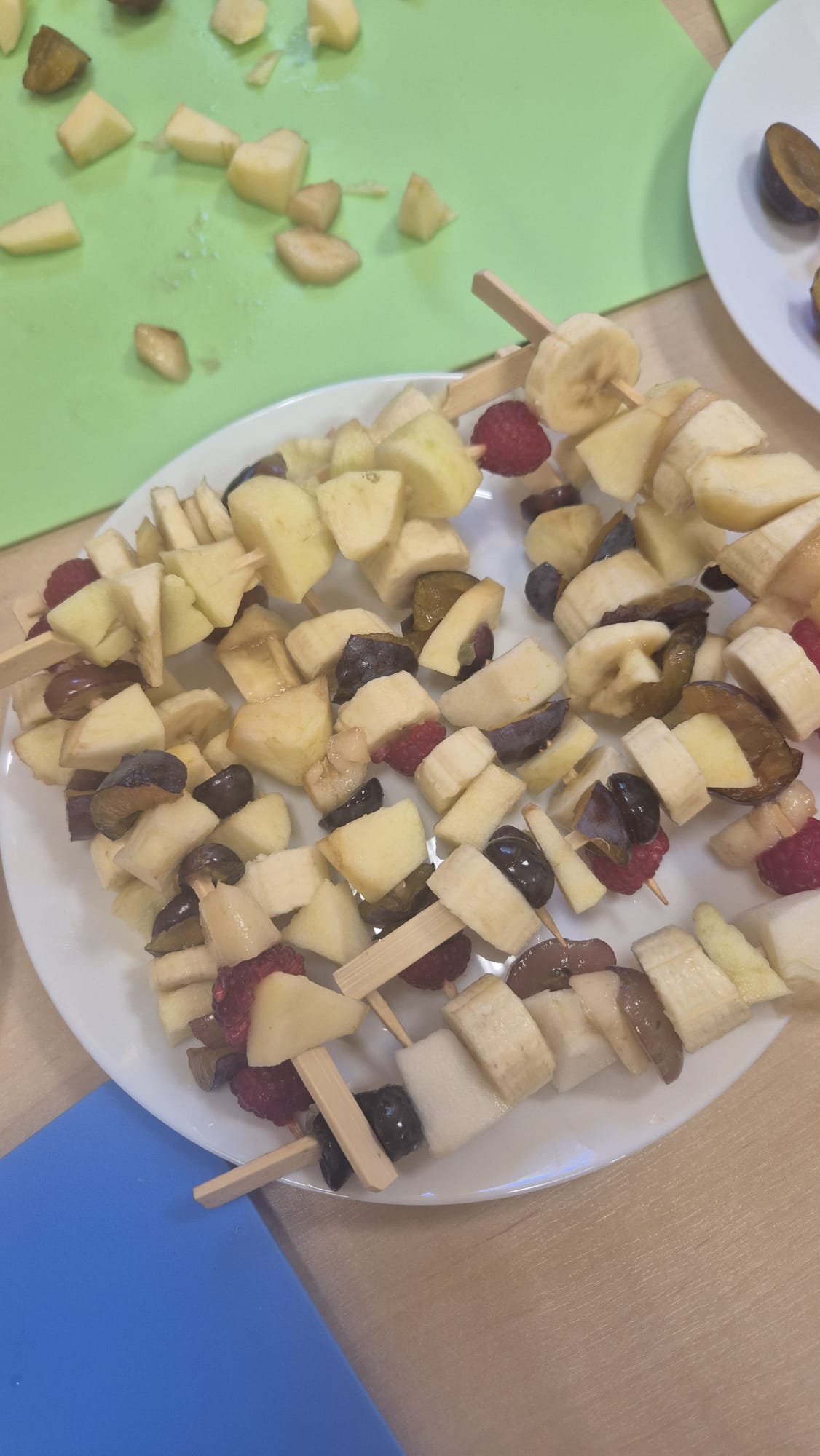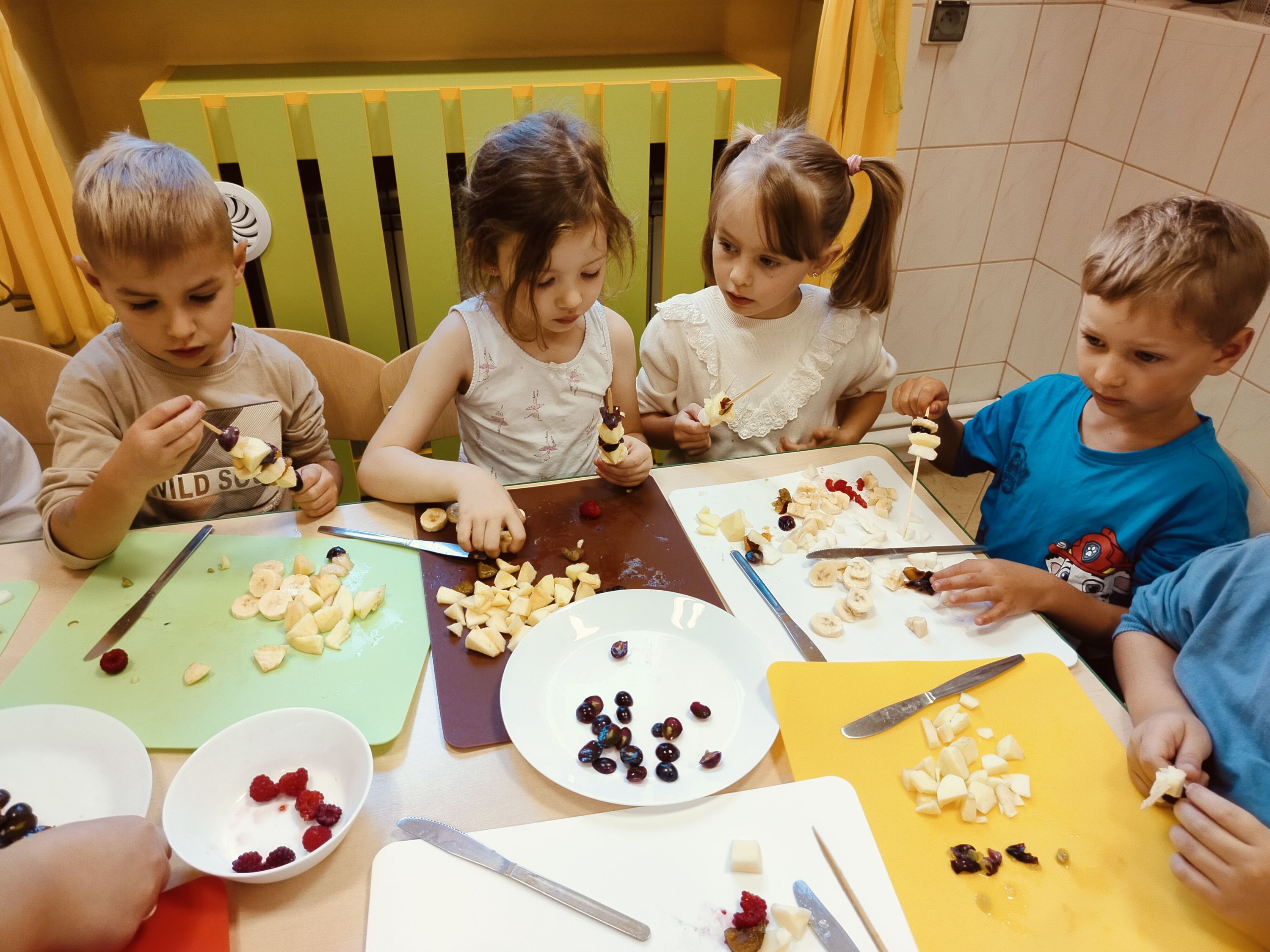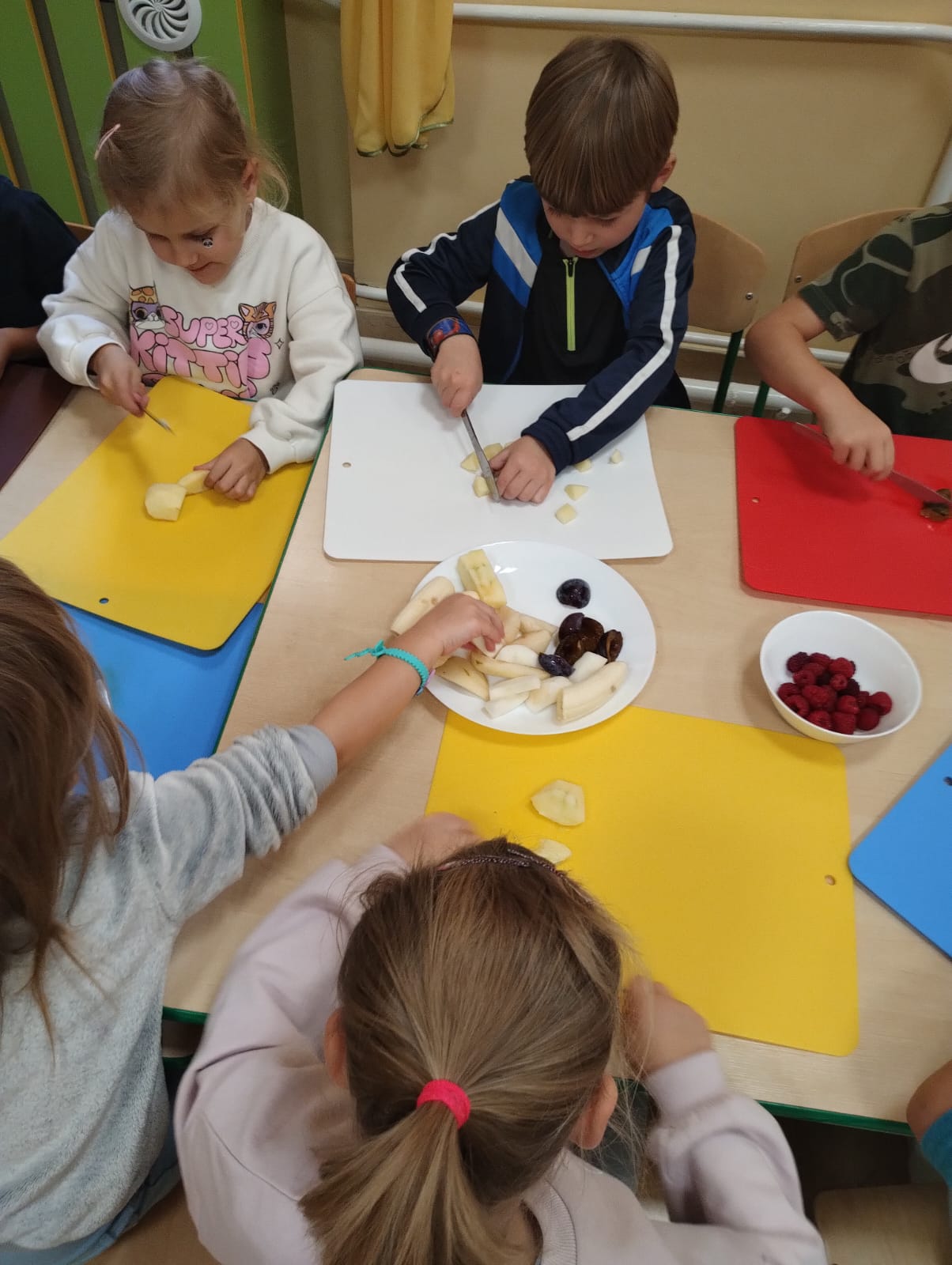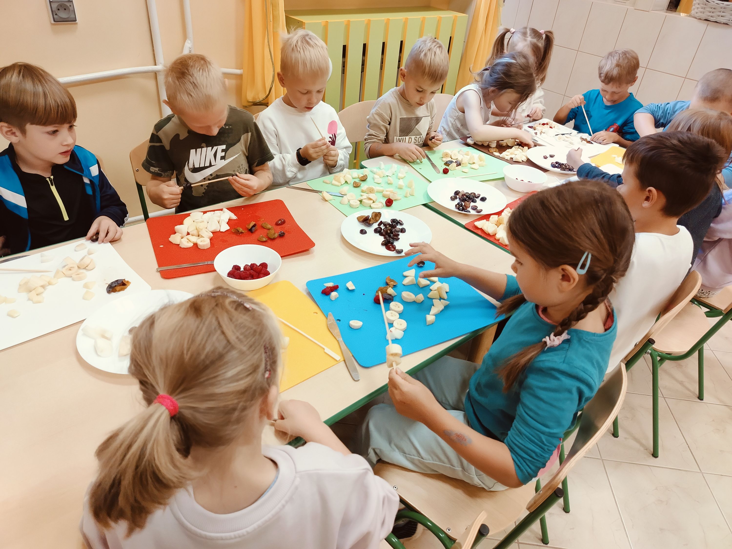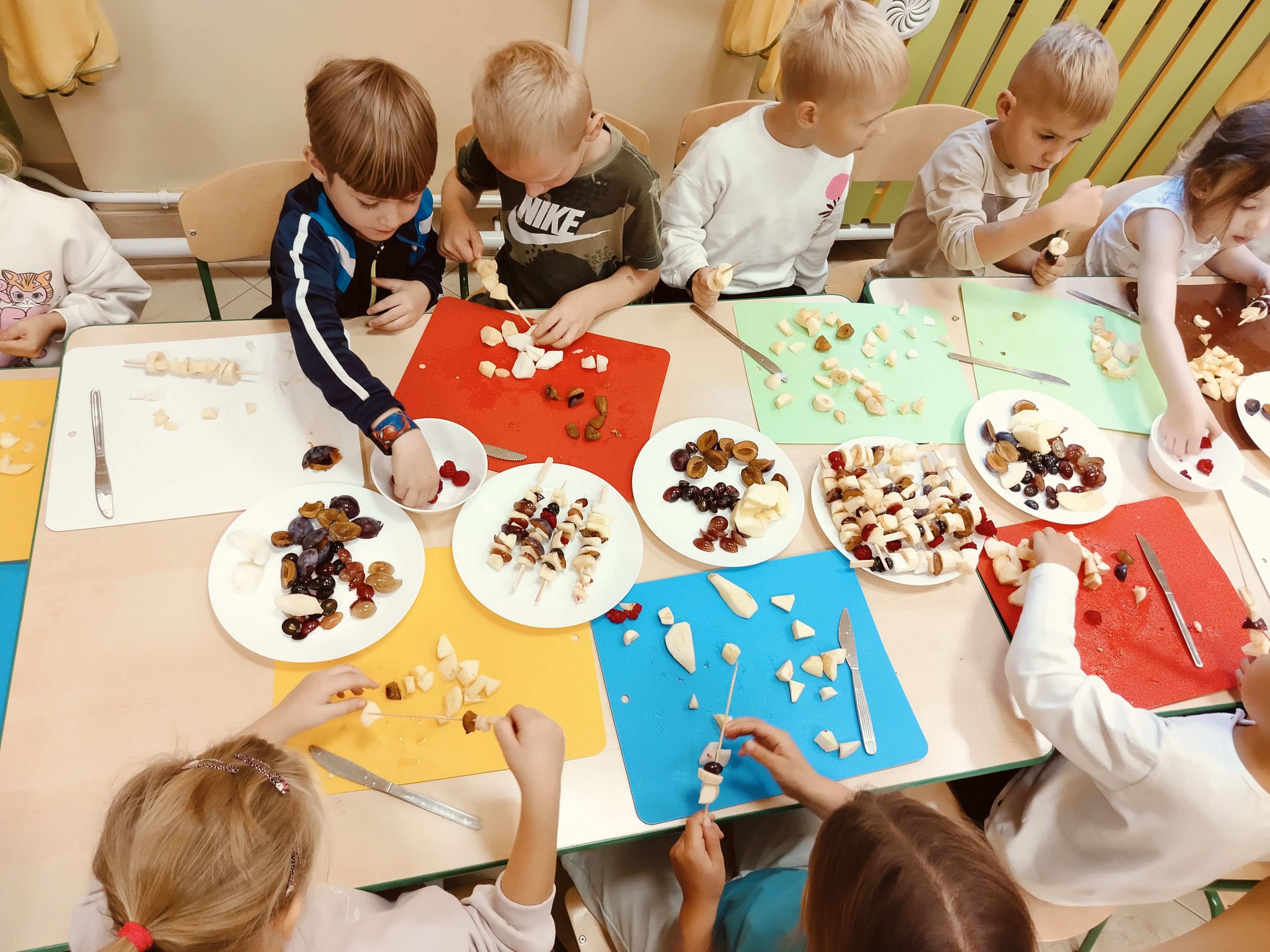 Jak jesień to oczywiście i jej owoce. Motylki i Pszczółki miały okazję poznawać je wielozmysłowo przez oglądanie, dotykanie, wąchanie, smakowanie. Ale na tym nie koniec. Dzieci mogły zrobić owocowe szaszłyki, które z apetytem zjadły na drugie śniadanie. Zaangażowanie przedszkolaków było ogromne! Brawo!!!