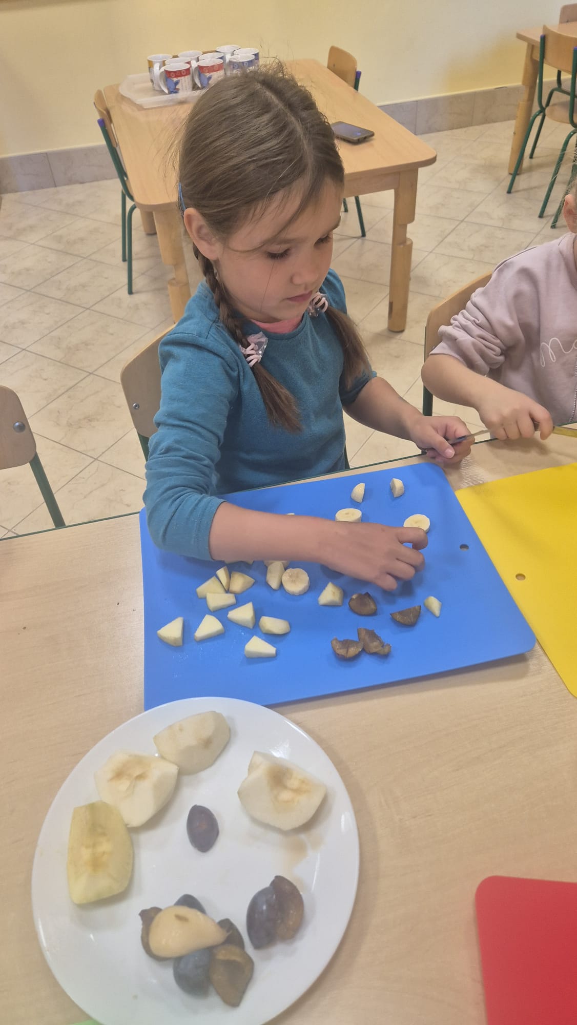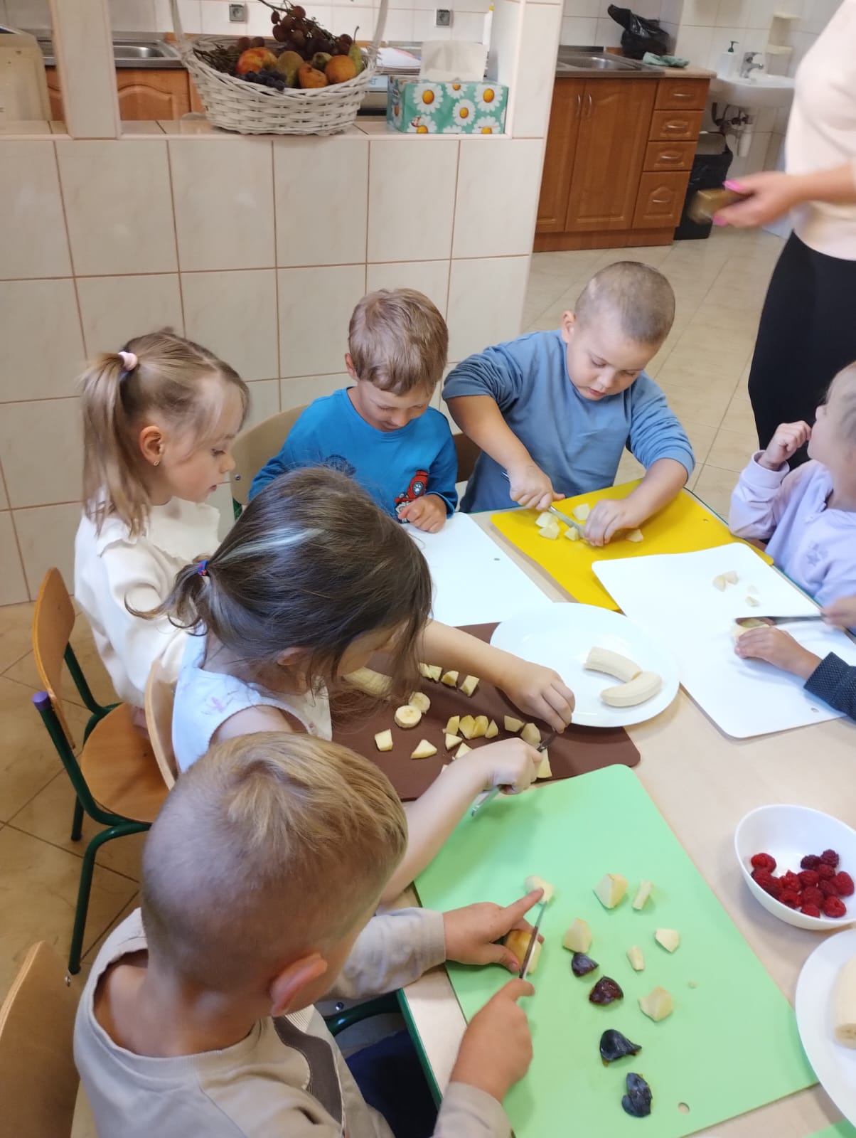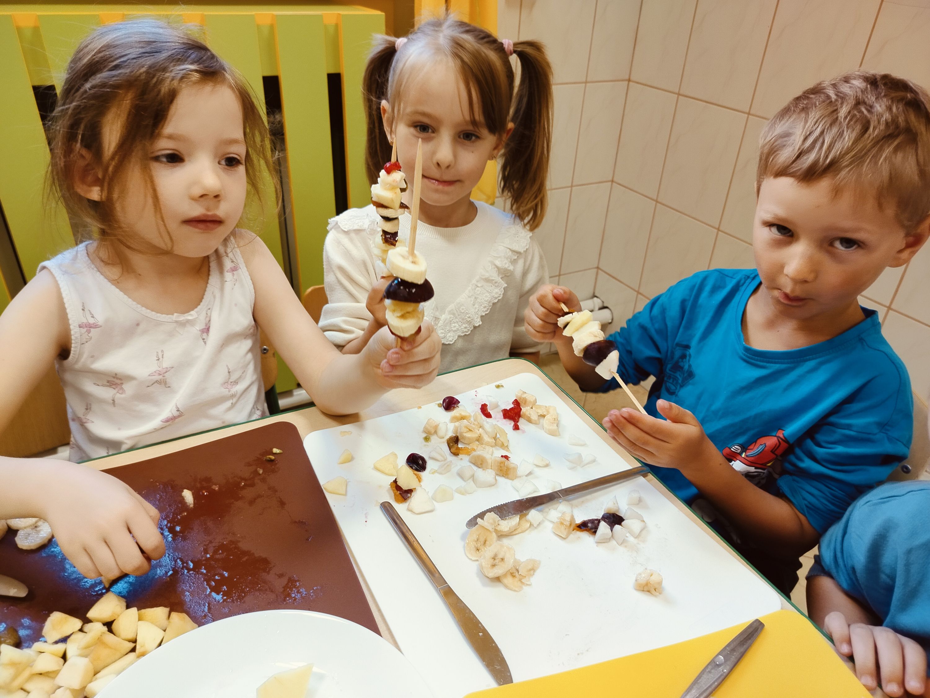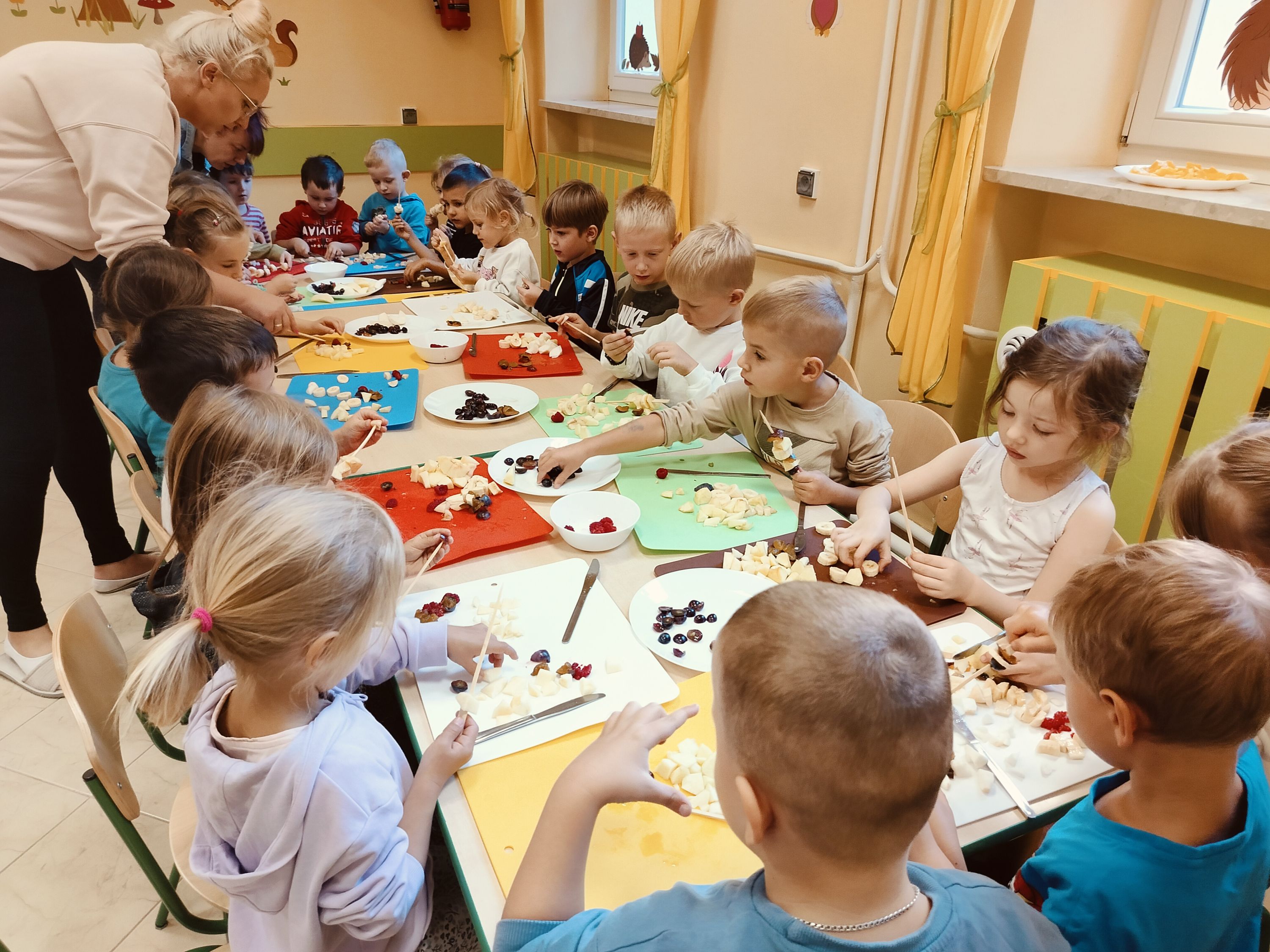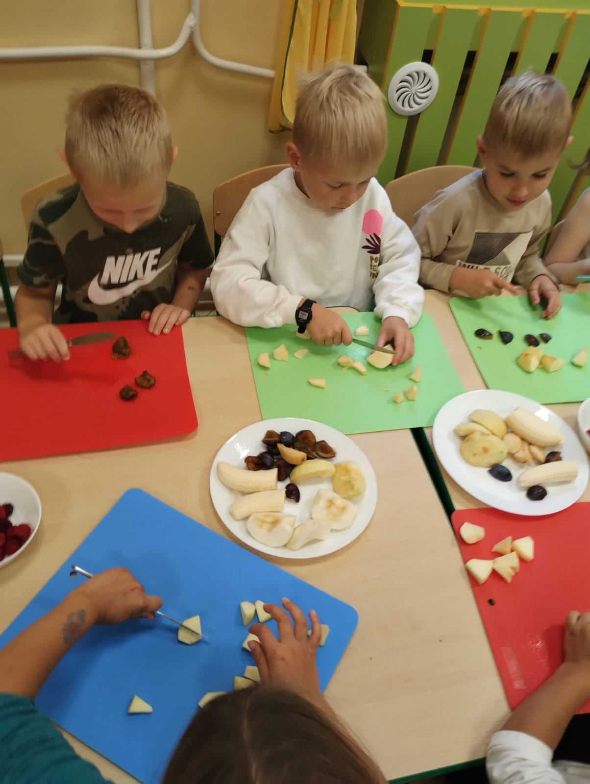 Jak jesień to oczywiście i jej owoce. Motylki i Pszczółki miały okazję poznawać je wielozmysłowo przez oglądanie, dotykanie, wąchanie, smakowanie. Ale na tym nie koniec. Dzieci mogły zrobić owocowe szaszłyki, które z apetytem zjadły na drugie śniadanie. Zaangażowanie przedszkolaków było ogromne! Brawo!!!