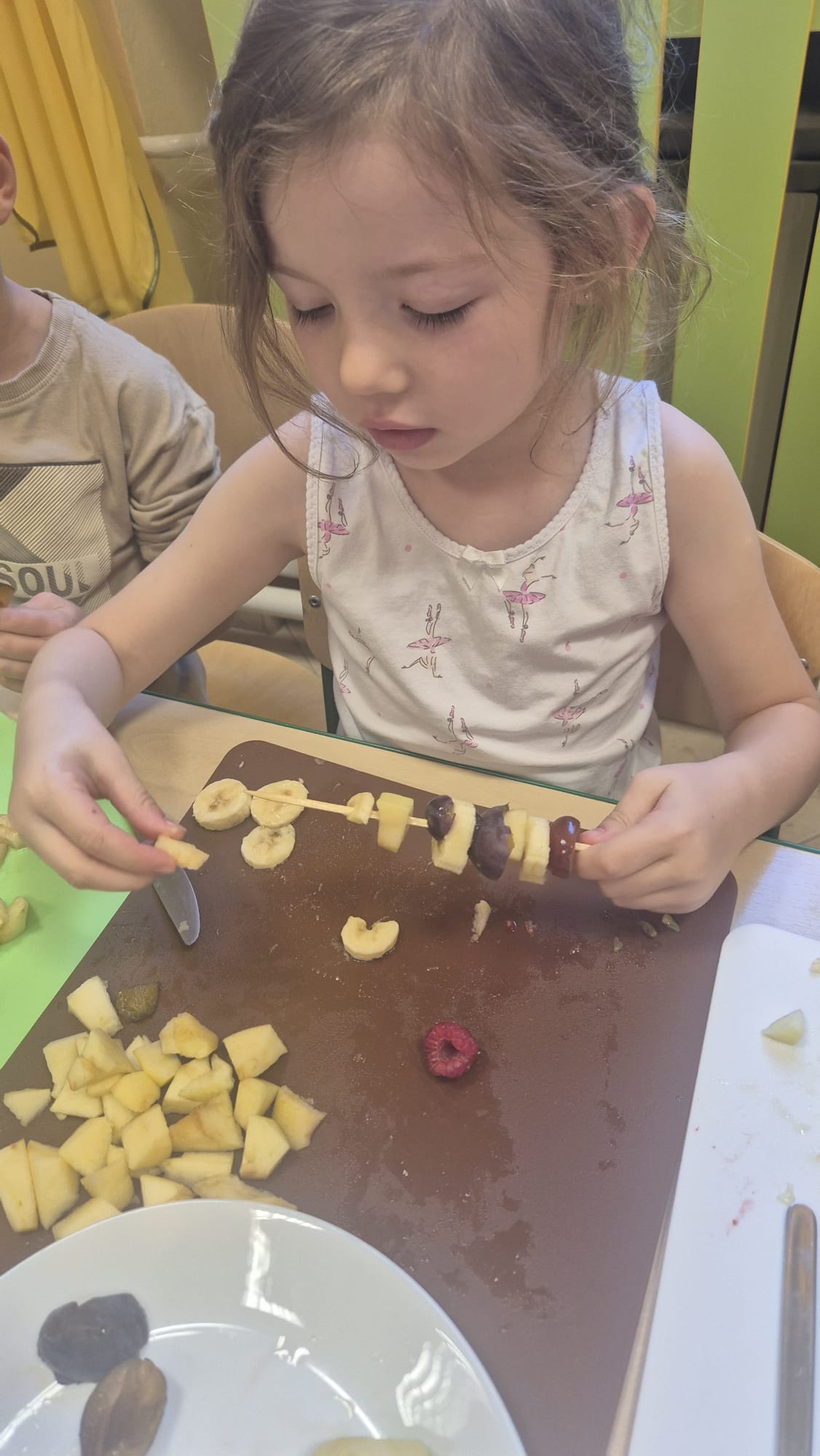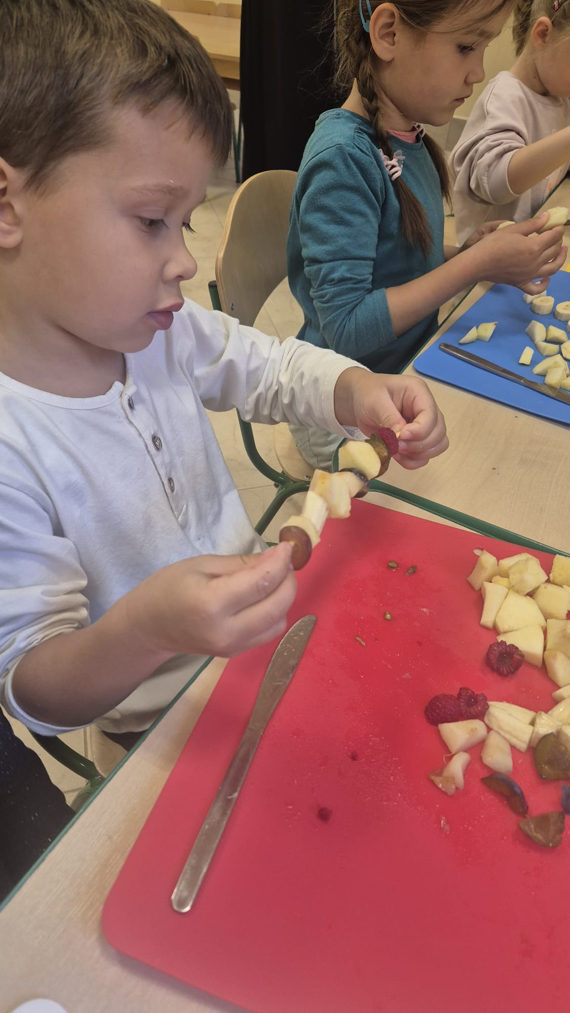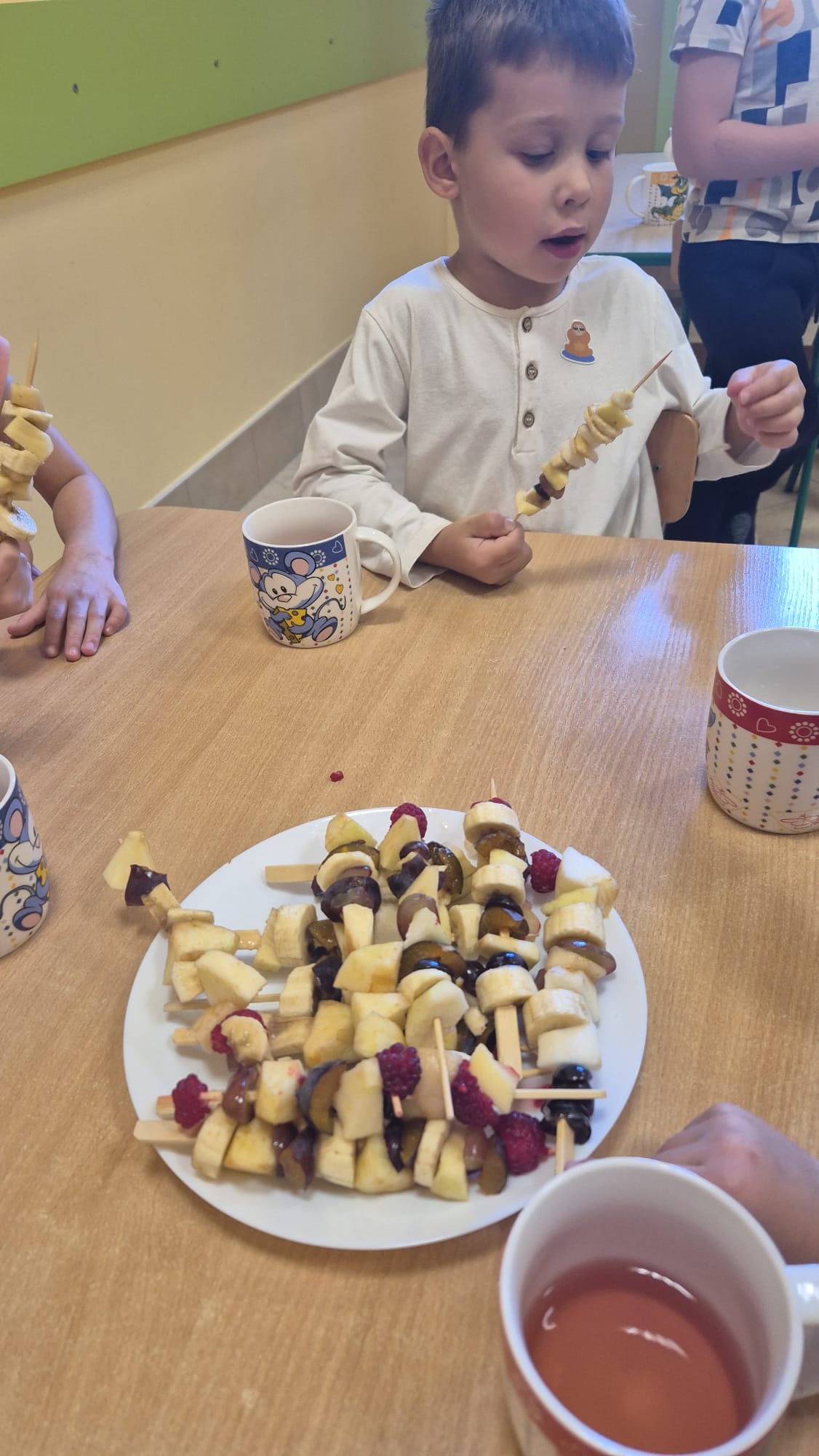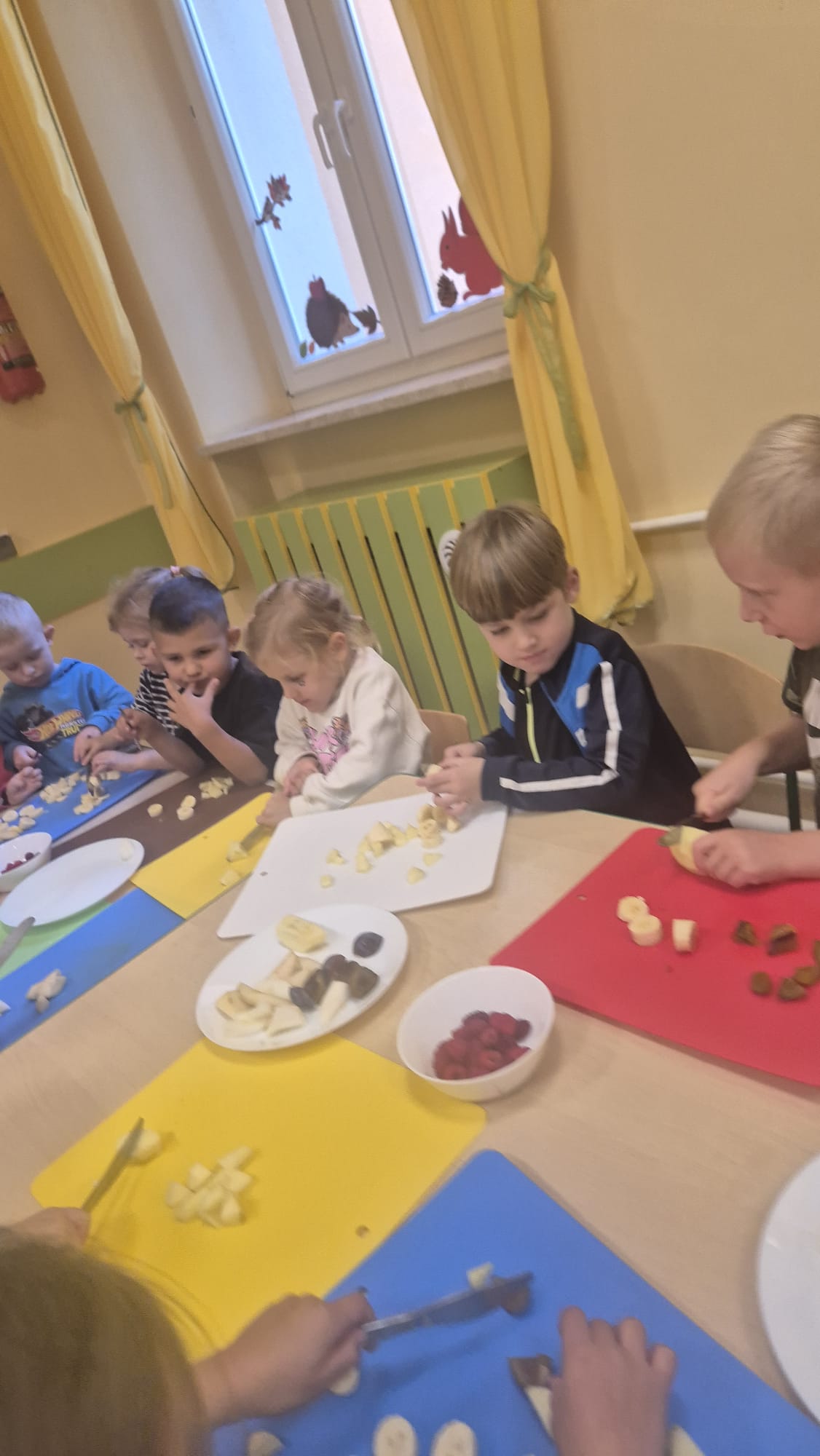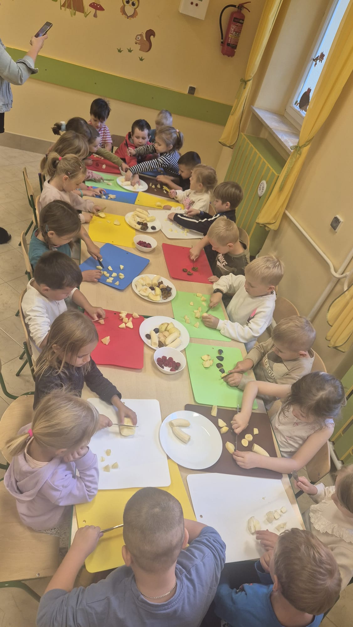Jak jesień to oczywiście i jej owoce. Motylki i Pszczółki miały okazję poznawać je wielozmysłowo przez oglądanie, dotykanie, wąchanie, smakowanie. Ale na tym nie koniec. Dzieci mogły zrobić owocowe szaszłyki, które z apetytem zjadły na drugie śniadanie. Zaangażowanie przedszkolaków było ogromne! Brawo!!!