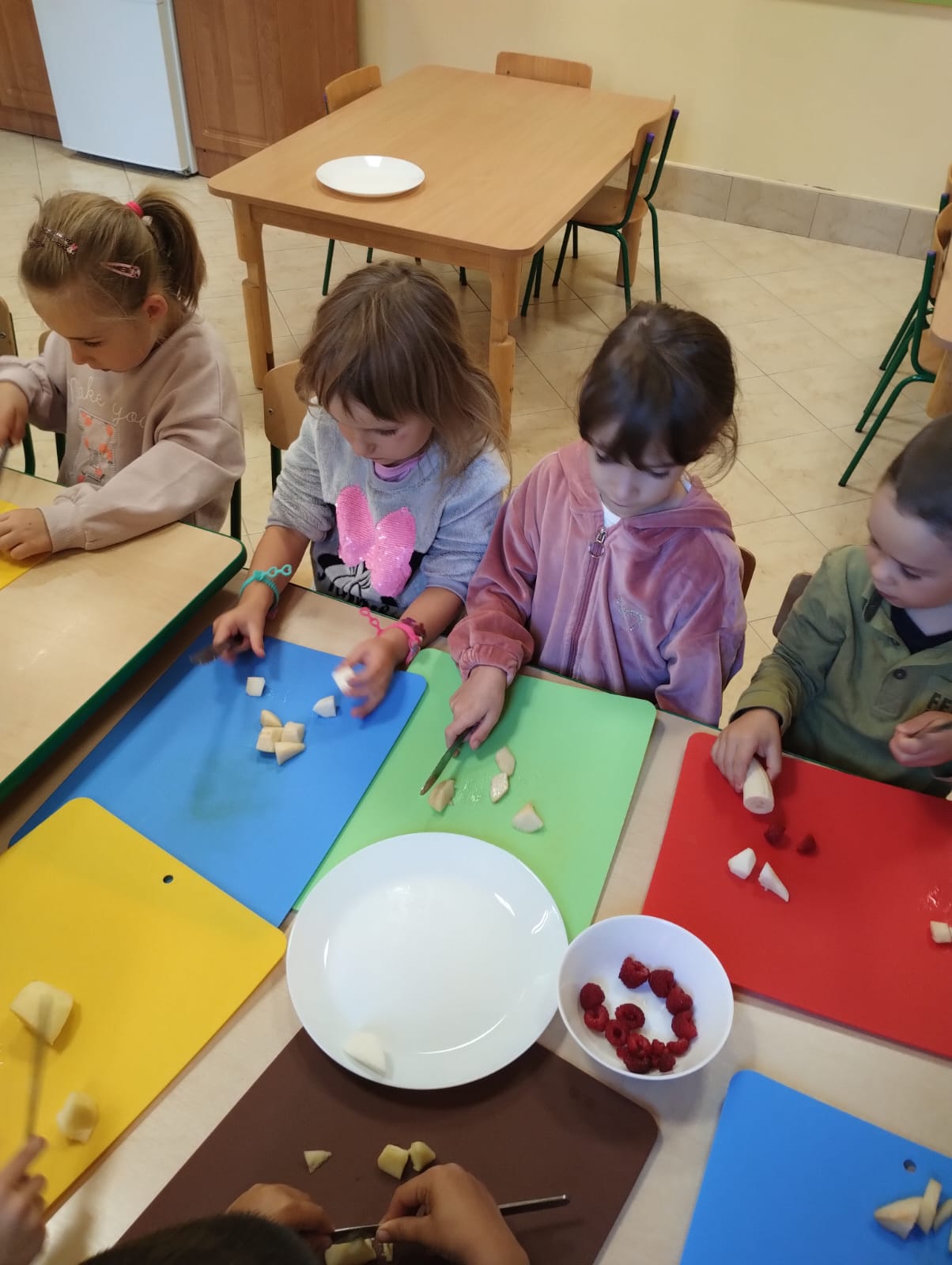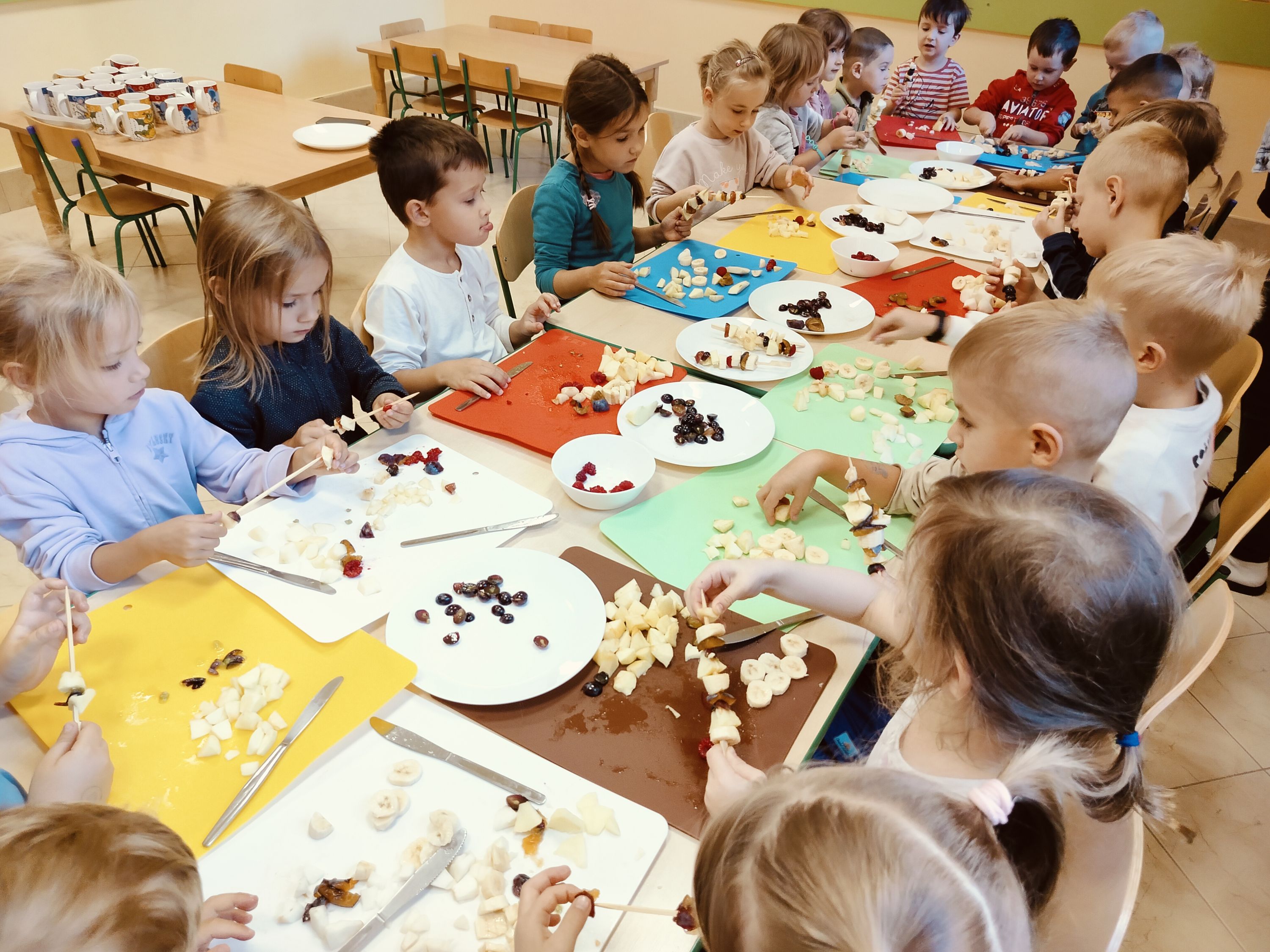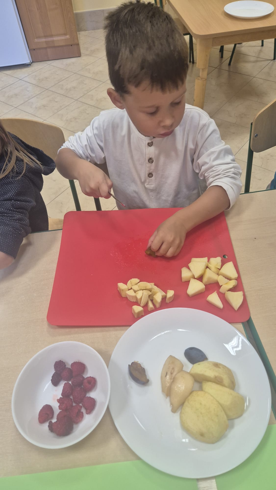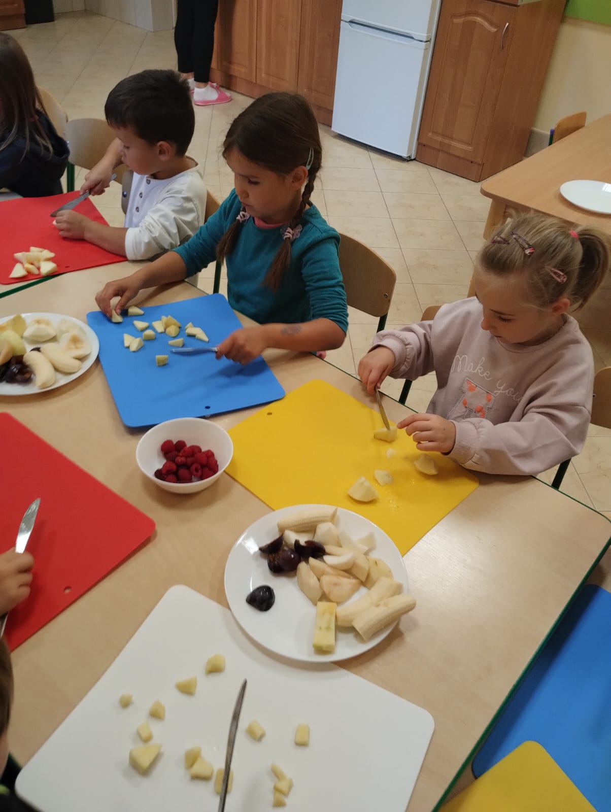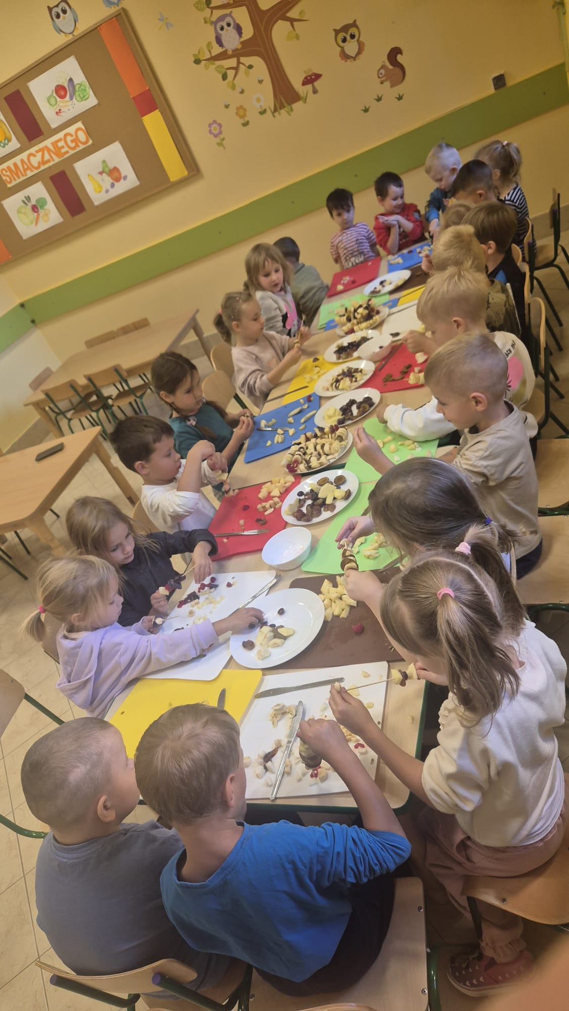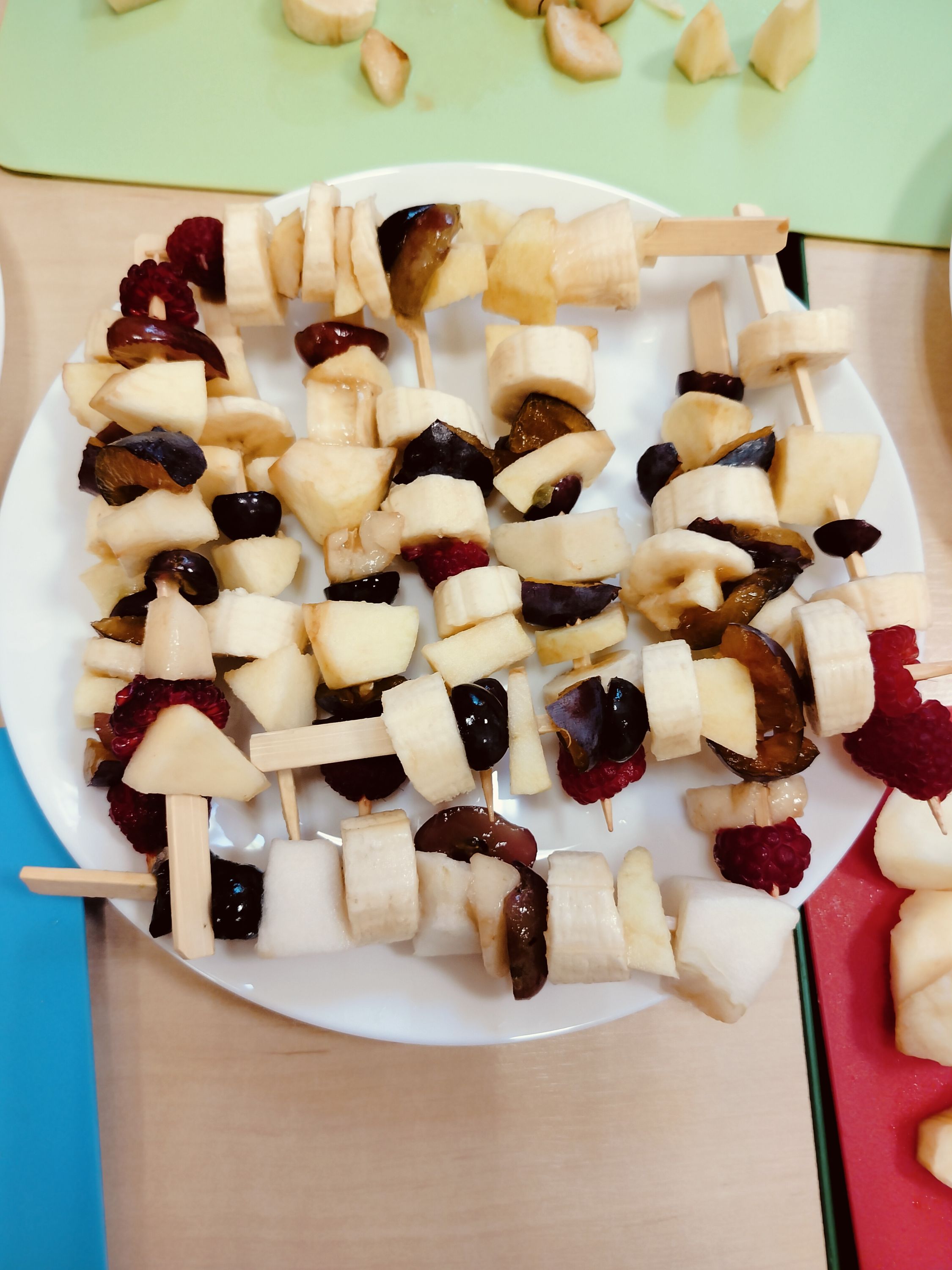 Jak jesień to oczywiście i jej owoce. Motylki i Pszczółki miały okazję poznawać je wielozmysłowo przez oglądanie, dotykanie, wąchanie, smakowanie. Ale na tym nie koniec. Dzieci mogły zrobić owocowe szaszłyki, które z apetytem zjadły na drugie śniadanie. Zaangażowanie przedszkolaków było ogromne! Brawo!!!