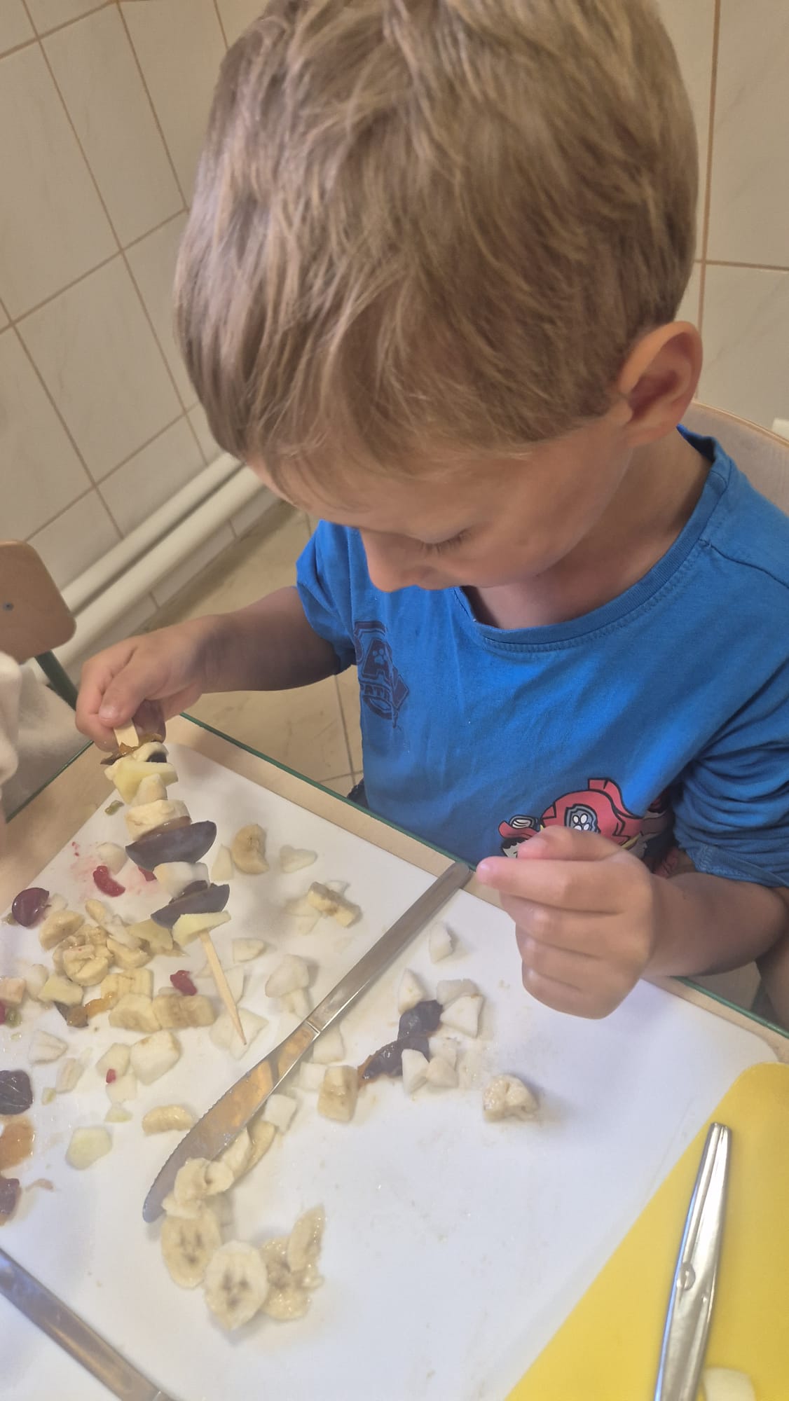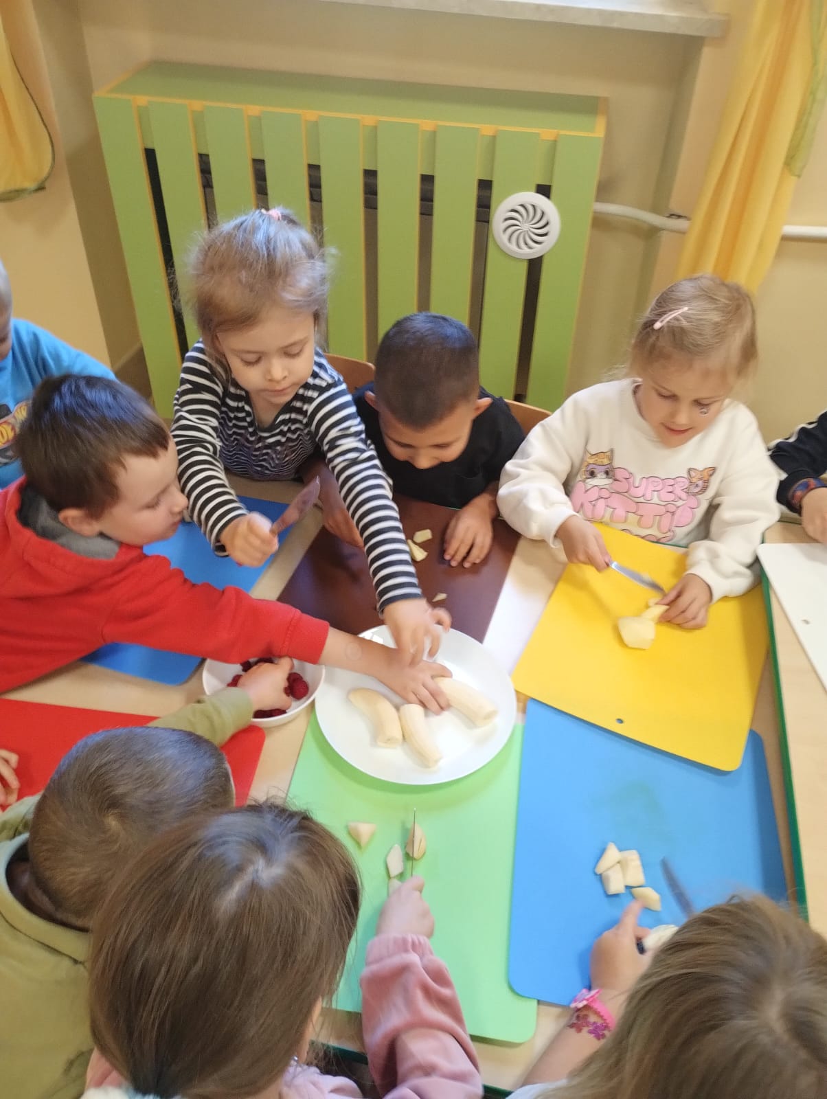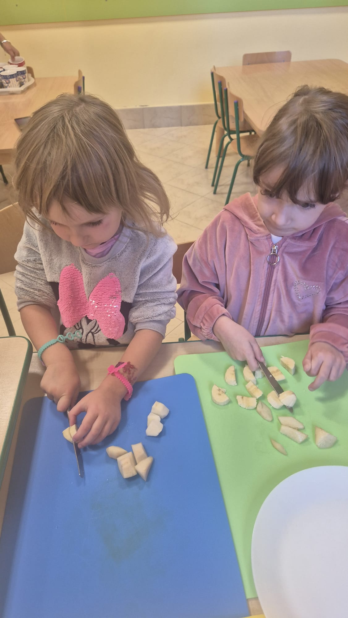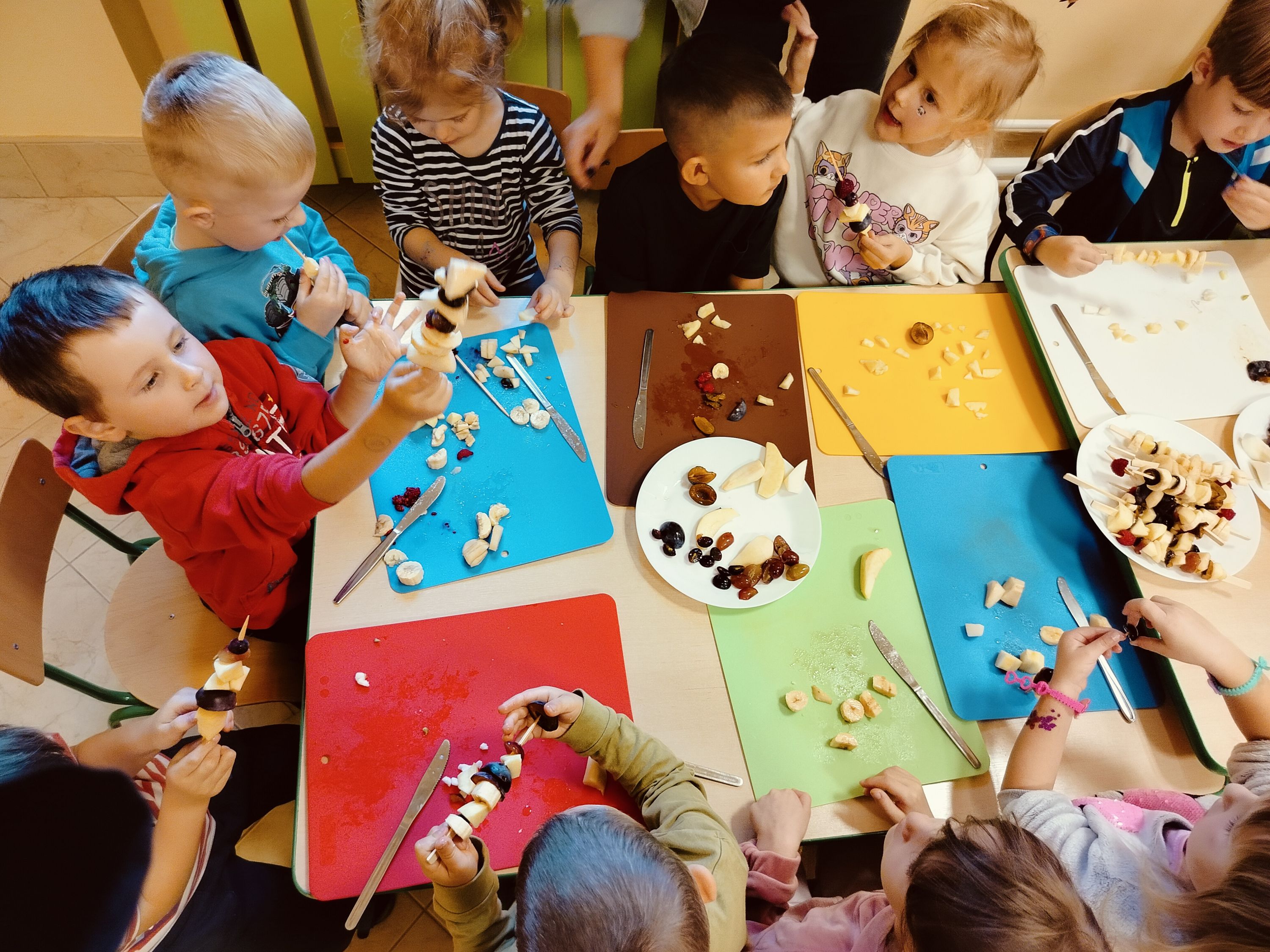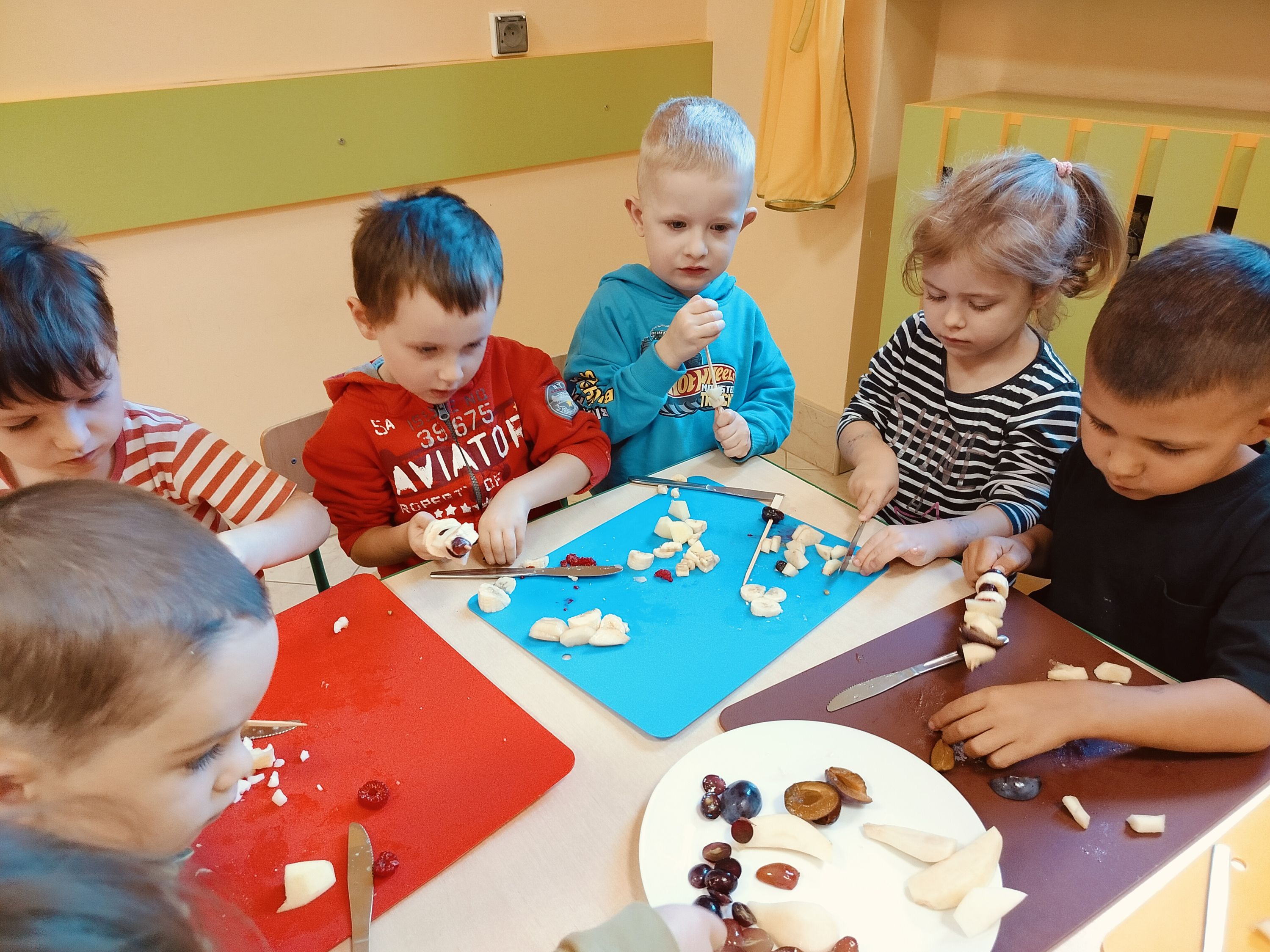 Jak jesień to oczywiście i jej owoce. Motylki i Pszczółki miały okazję poznawać je wielozmysłowo przez oglądanie, dotykanie, wąchanie, smakowanie. Ale na tym nie koniec. Dzieci mogły zrobić owocowe szaszłyki, które z apetytem zjadły na drugie śniadanie. Zaangażowanie przedszkolaków było ogromne! Brawo!!!