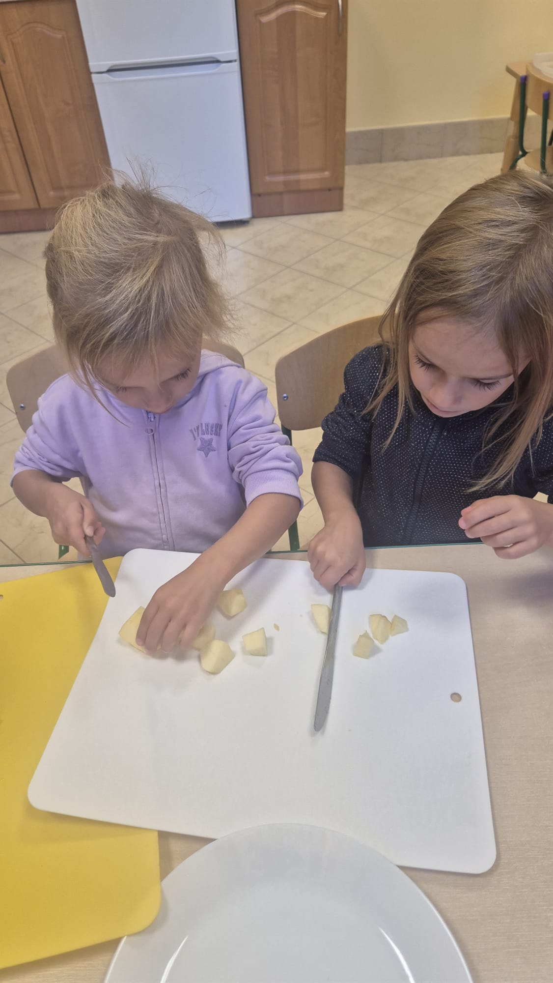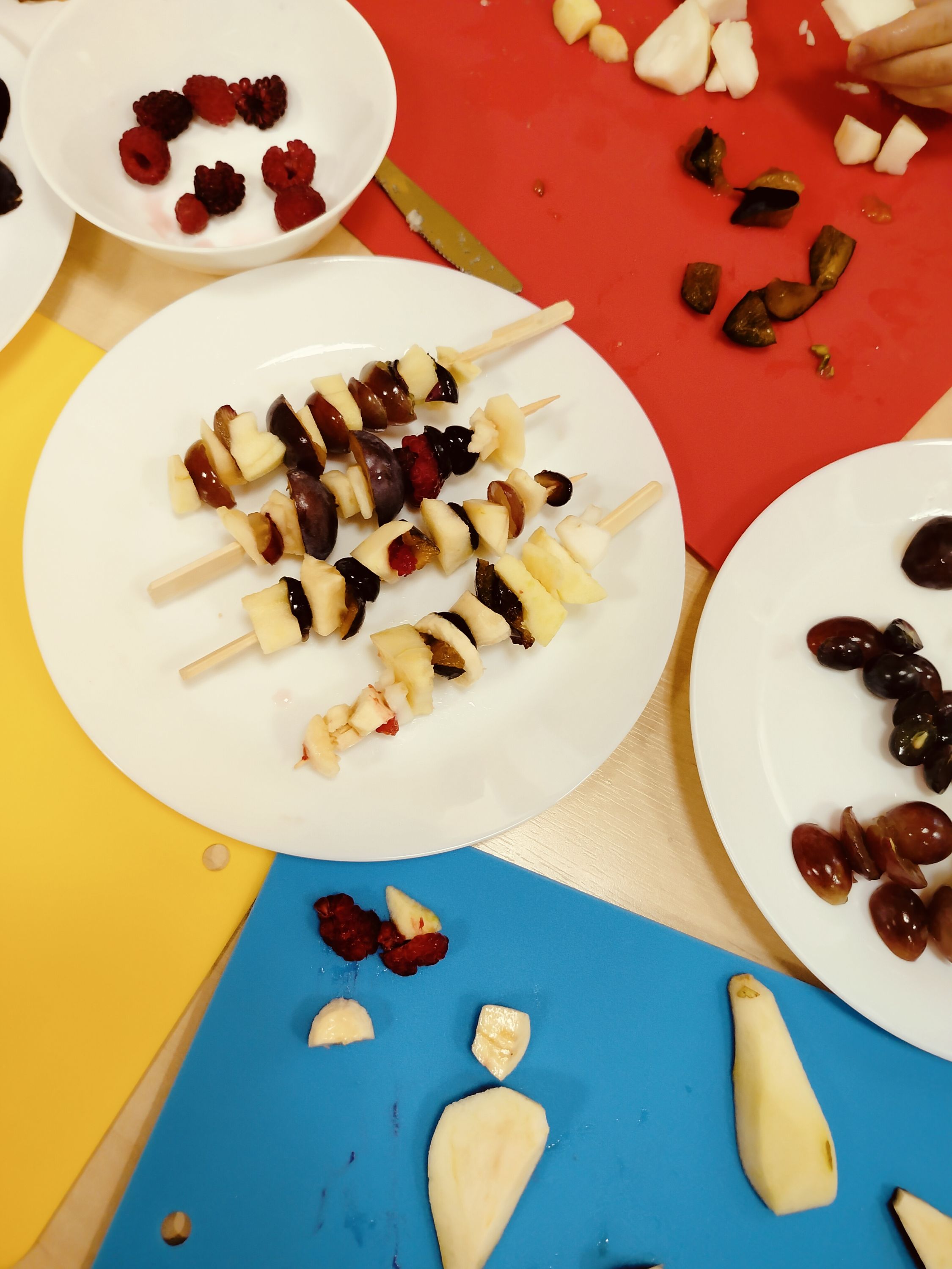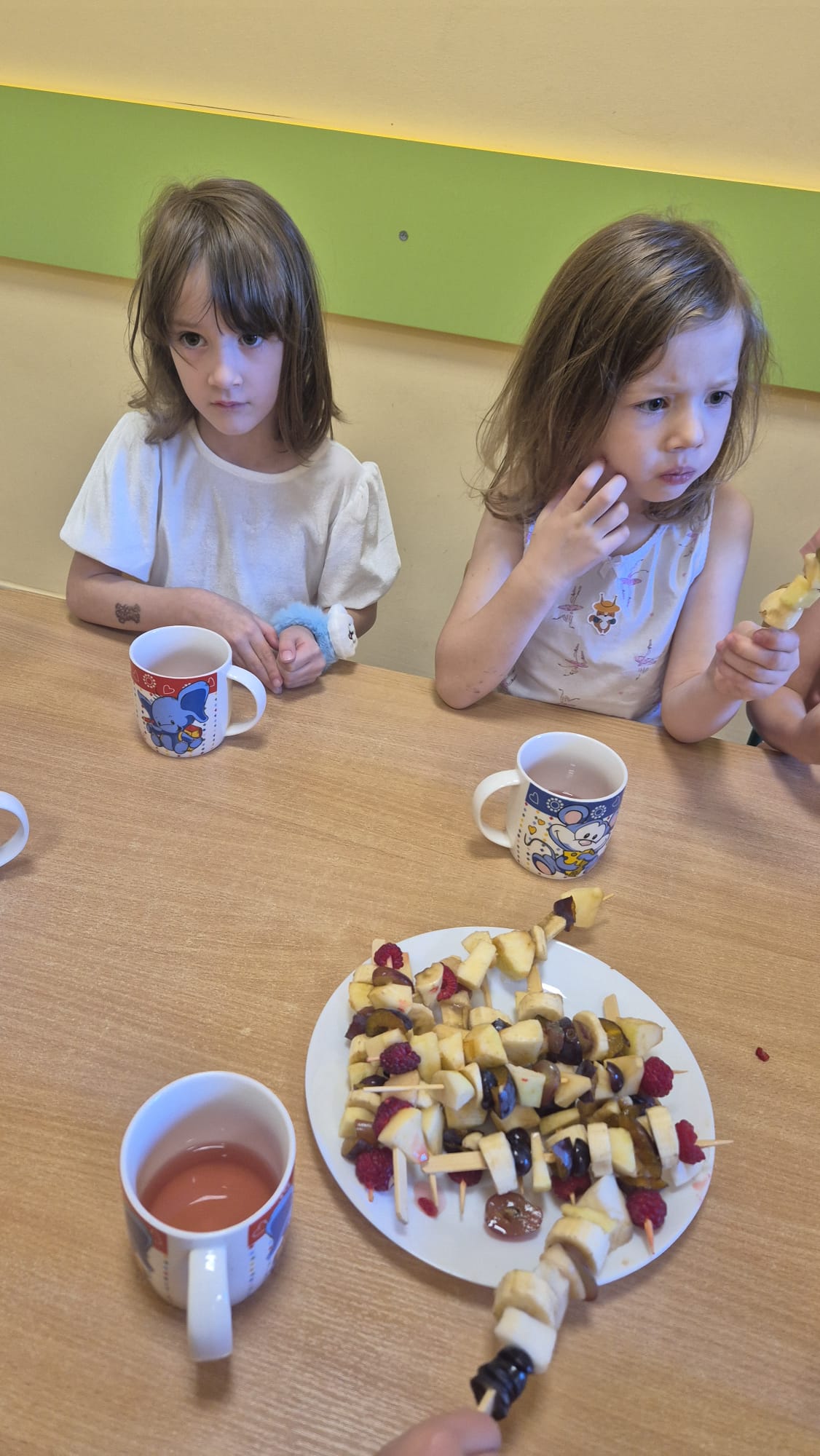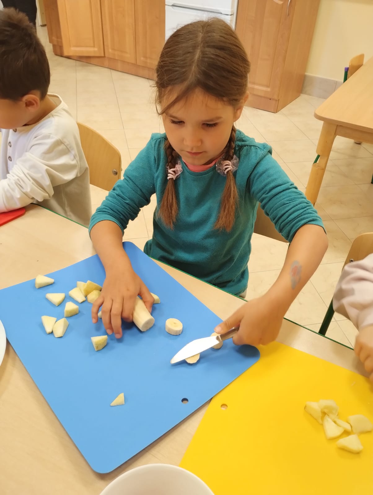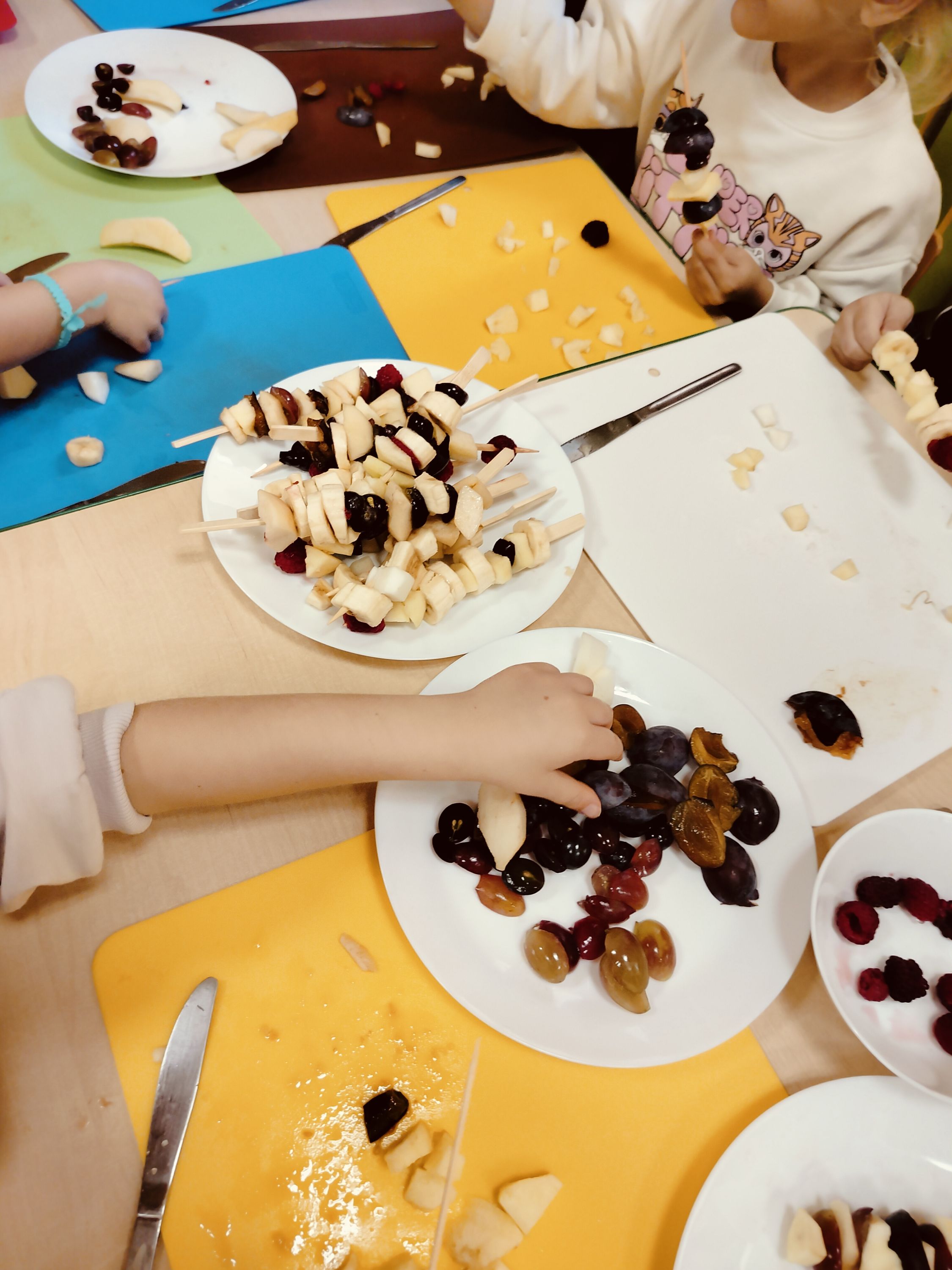 Jak jesień to oczywiście i jej owoce. Motylki i Pszczółki miały okazję poznawać je wielozmysłowo przez oglądanie, dotykanie, wąchanie, smakowanie. Ale na tym nie koniec. Dzieci mogły zrobić owocowe szaszłyki, które z apetytem zjadły na drugie śniadanie. Zaangażowanie przedszkolaków było ogromne! Brawo!!!